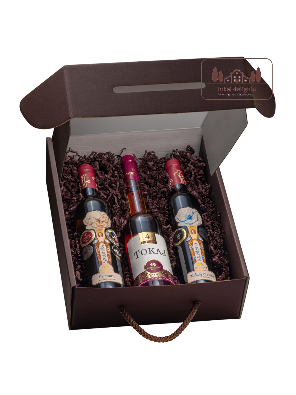 Každá kvapka tohto jedinečného setu vám otvára dvere do sveta prestížnych vín. Predstavujeme vám tri výnimočné poklady, ktoré získali veľké zlaté medaile na medzinárodných súťažiach. Tokaj cuvée Saturnia, ľadové víno z roku 2018, ktoré si odnieslo Veľkú zlatú medailu z Prague Wine Trophy 2020, je dokonalou harmóniou sladkosti a sviežosti. Furmint Saturnia, hrozienkový výber z toho istého roku, ktorý očaril porotu na Texas International Wine Competition USA 2020, ponúka unikátny zážitok plný intenzívnych aróm zrelého ovocia. A nakoniec, Tokajský výber 4 putňový z roku 2003, korunovaný Veľkou zlatou medailou na Prague Wine Trophy 2019, je esenciou tokajskej tradície a umenia.